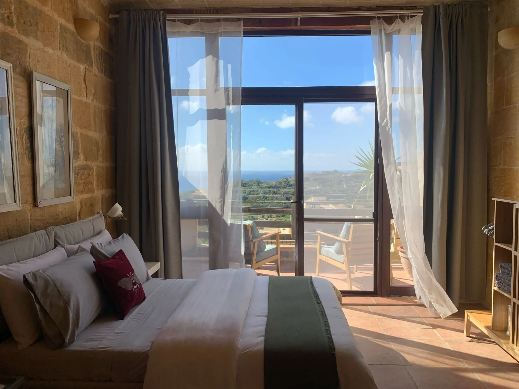 You will stay in a deluxe en-suite room in one of the farmhouses with your own private terrace boasting serene sea views overlooking Comino Island and the surrounding countryside. This room is on it’s own private floor for extra privacy.